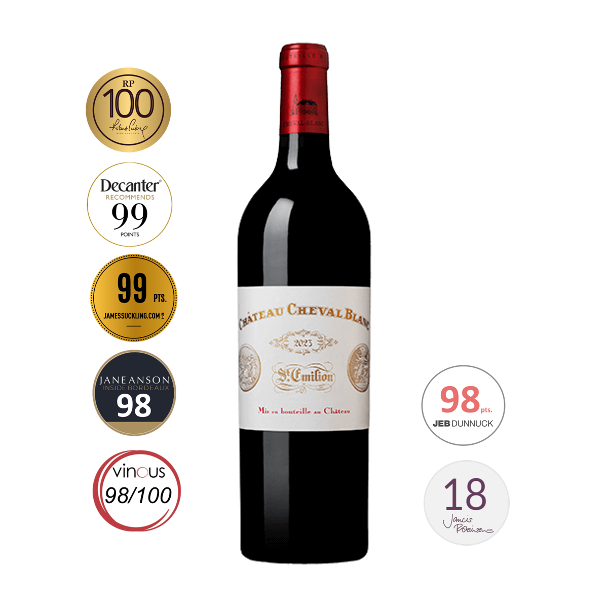 Uma mistura de 52% de Merlot, 46% de Cabernet Franc e 2% de Cabernet Sauvignon, envelhecida quase na totalidade em barricas novas, com uma pequena quantidade em barricas usadas uma vez e em foudres (cerca de 10% da mistura), o Château Cheval Blanc 2023 é um Cheval Blanc absolutamente emblemático, que se caracteriza pela complexidade, requinte e elegância. Aromas de groselha preta, amora, grafite, madeira picante, fumo e pedra triturada vão lentamente ganhando um toque de violetas e flores com o tempo no copo. Apresenta uma textura maravilhosa, corpo médio a encorpado e um equilíbrio impecável, com taninos maduros e polidos e um final magnífico. Pertence possivelmente à mesma família do 2019 e irá brilhar após 5 a 7 anos de envelhecimento em garrafa, evoluindo durante mais de 30 anos no que diz respeito ao seu equilíbrio e harmonia geral. Foram produzidas cerca de 10 683 caixas. Beber entre 2031 e 2055.
