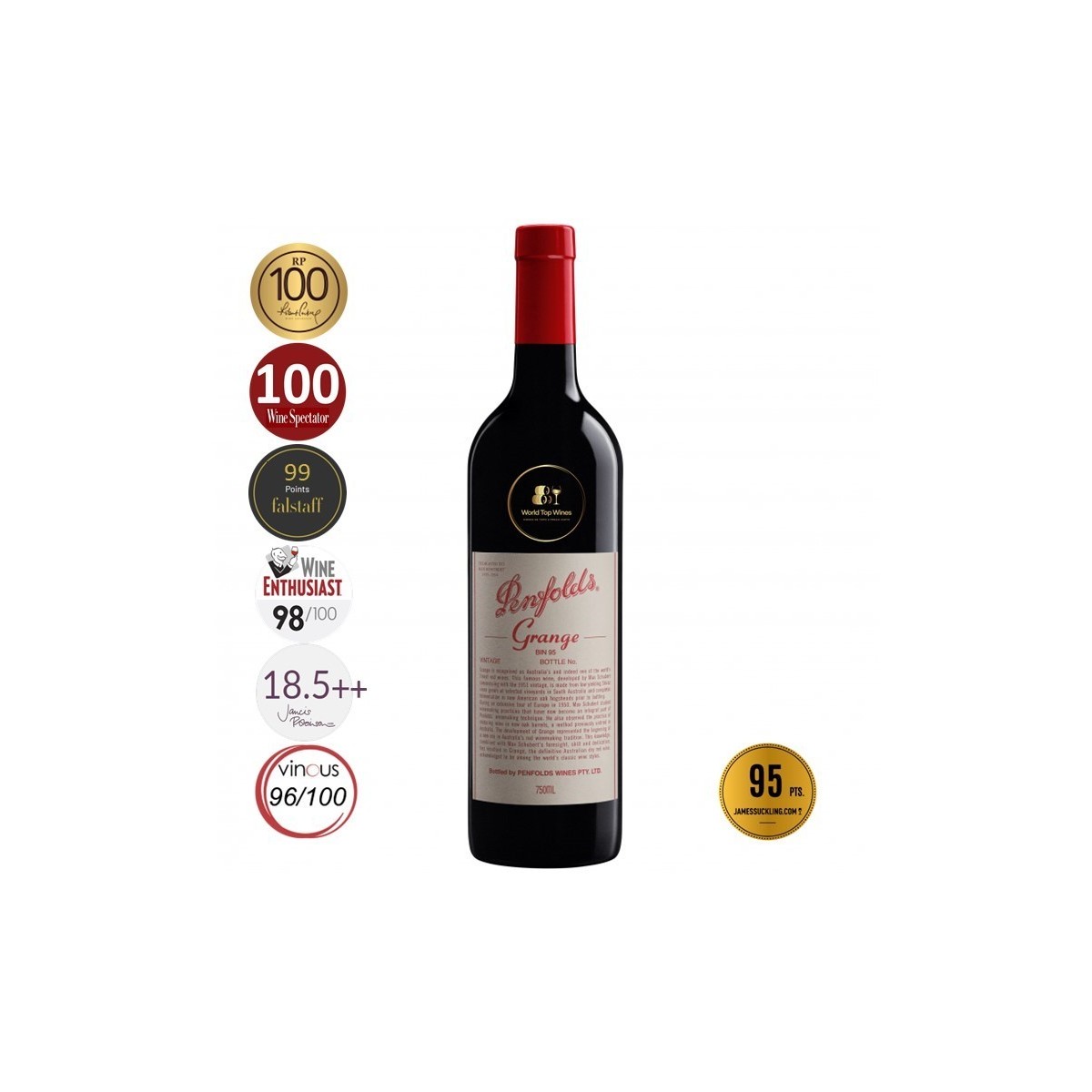 Penfolds Grange Bin 95 2008 é um dos grandes ícones do vinho australiano e a expressão máxima da casa Penfolds, fundada em 1844 em Adelaide. Criado por Max Schubert para rivalizar com os grandes tintos de Bordeaux, Grange tornou-se o vinho mais famoso da Austrália. Em 2008 o sul da Austrália viveu um ano difícil, com calor intenso, mas as vinhas velhas de Barossa, Clare Valley e Magill Estate, cuidadosamente geridas, deram uvas muito concentradas, com cor profunda, taninos firmes e excelente maturação fenólica – base perfeita para um Grange de grande longevidade.
