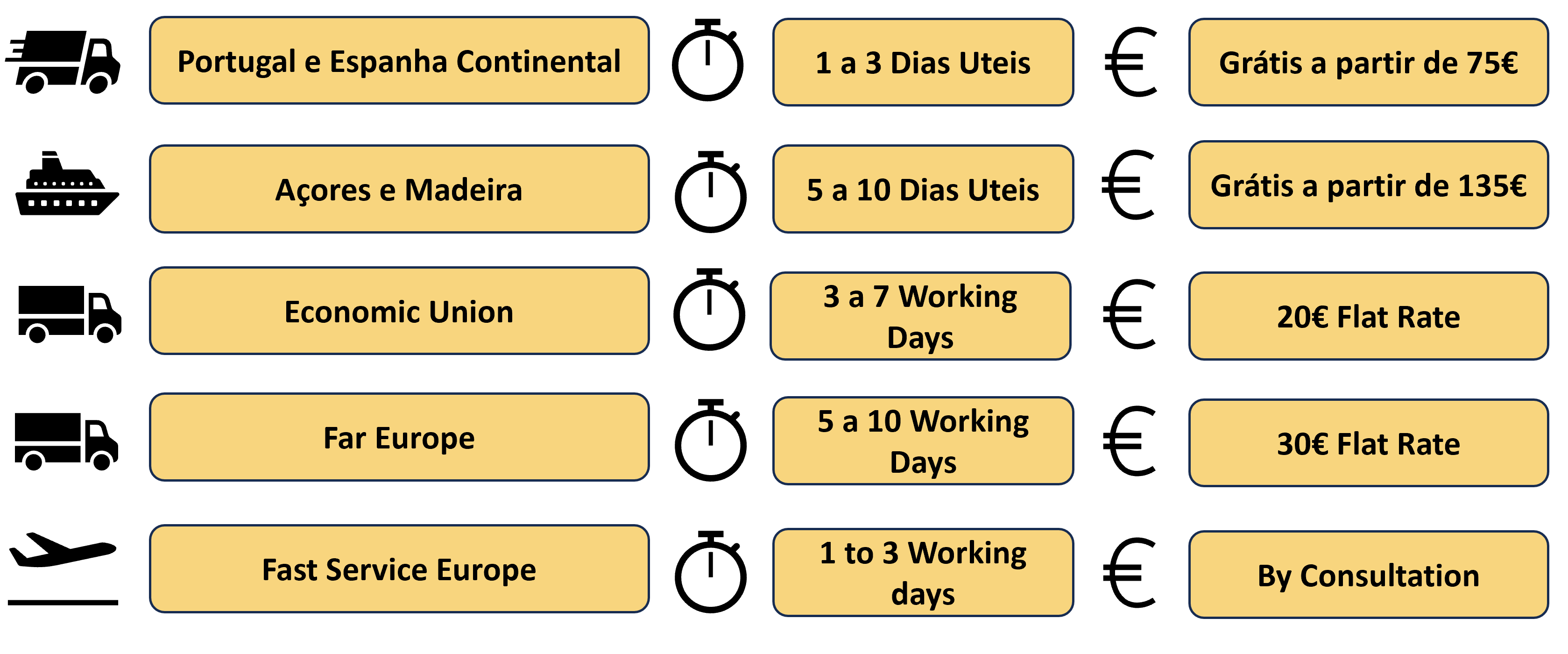 - Grátis a partir de 75€: Entregas Portugal e Espanha Continental